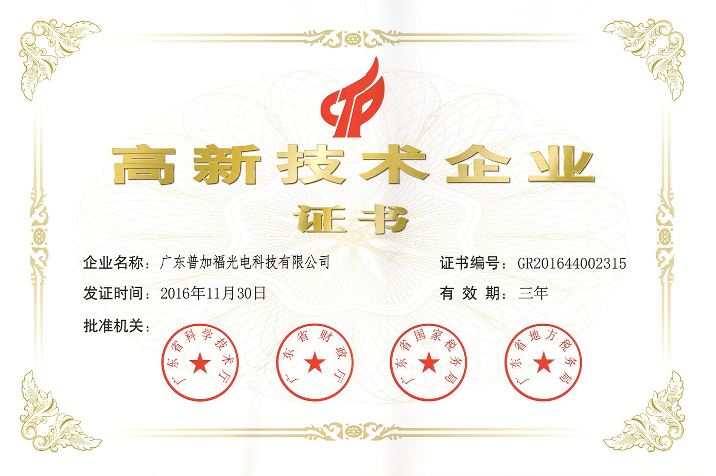 2016年11月30日,我司(PolyOptoElectronicsLtd)榮獲廣東省頒發的“高新技術企業”證...
